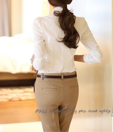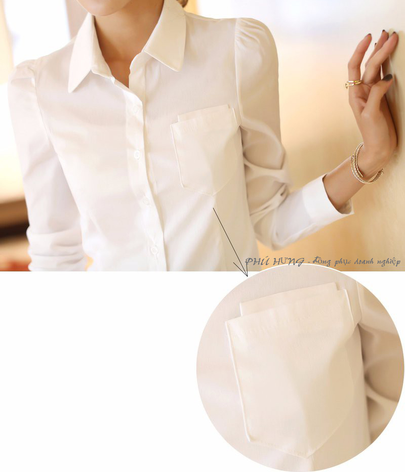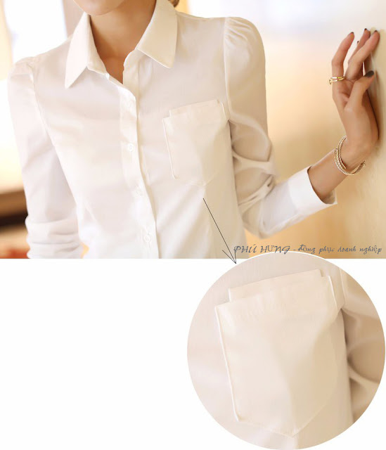 Áo màu trắng, cổ áo thiết kế thêm túi trước ngực tạo điểm nhấn mới mẻ cho trang phục bạn gái. Bạn có thể kết hợp áo cùng quần kaki, skinny, quần Âu, chân váy… đến công sở